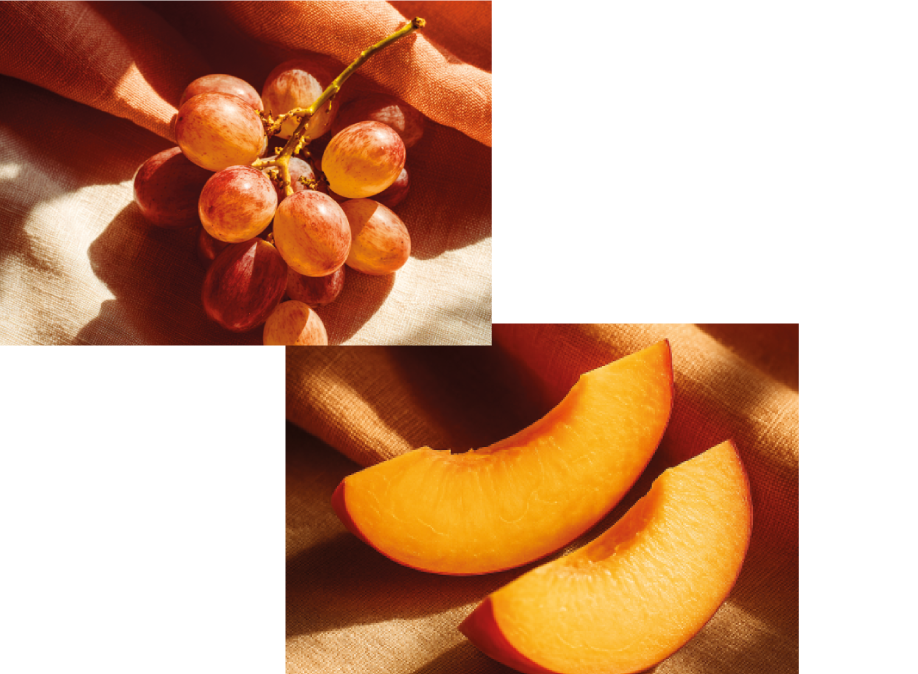 Au cœur de cette gamme se dévoile un duo fruité emblématique des étés toscans : la Pêche et le Raisin.